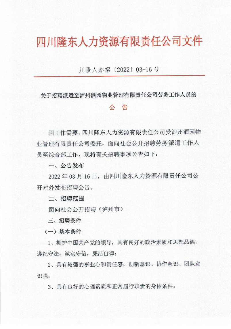 關(guān)于招聘派遣至瀘洲酒園物業(yè)管理有限責(zé)任公司勞務(wù)人員的公告