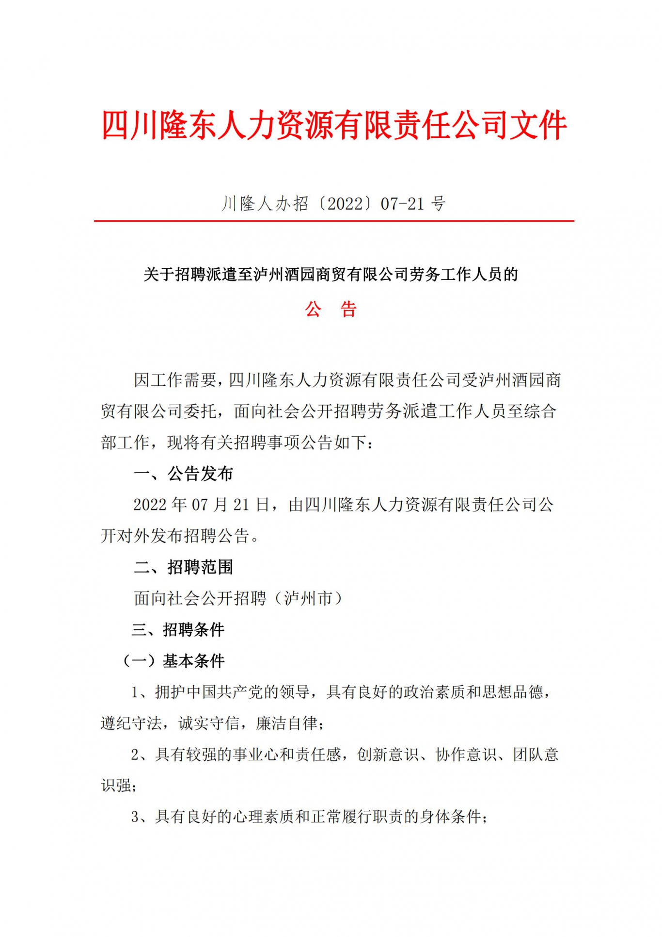 關于招聘派遣至瀘州酒園商貿(mào)有限公司勞務工作人員的公告