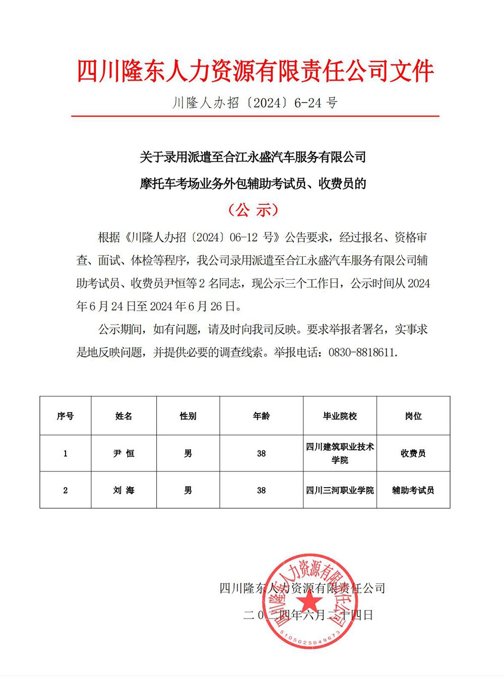 因工作需要,四川隆東人力資源有限責(zé)任公司面向社會公開招聘勞務(wù)工作人員至合江永盛汽車服務(wù)有限公司工作,現(xiàn)將有關(guān)招聘事項公告如下: